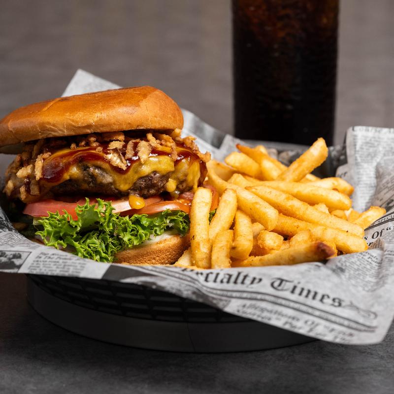 Fresh Angus Chuck ½ lb grilled patty with fried onions, BBQ sauce, cheddar cheese