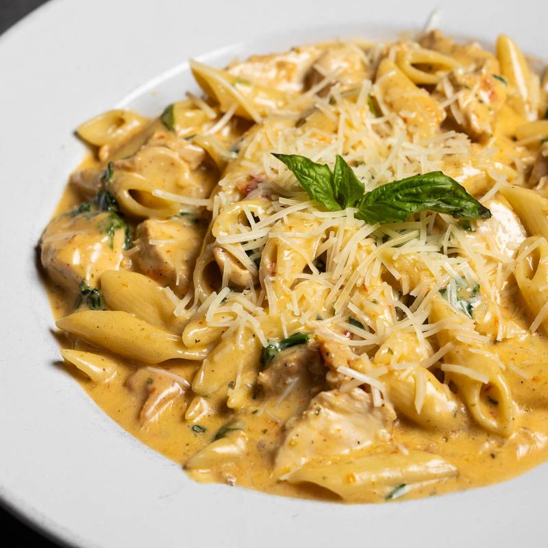 Penne pasta tossed with homemade sun-dried tomato pesto cream sauce