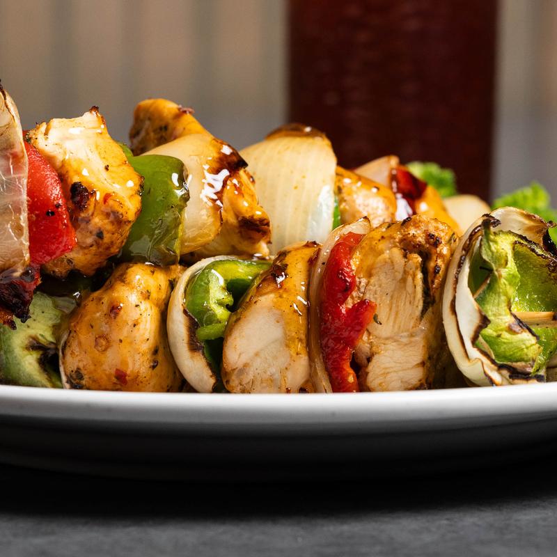 Grilled marinated chicken with vegetables on a skewer, brushed with spicy honey glaze. Served with warm pita bread, tzatziki sauce, with two sides