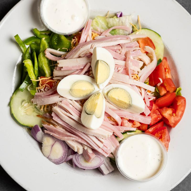 Ham, turkey & egg, served on a bed of romaine & iceberg mix, tomato, cucumber, onion, green pepper, carrot & mixed cheddar jack cheese